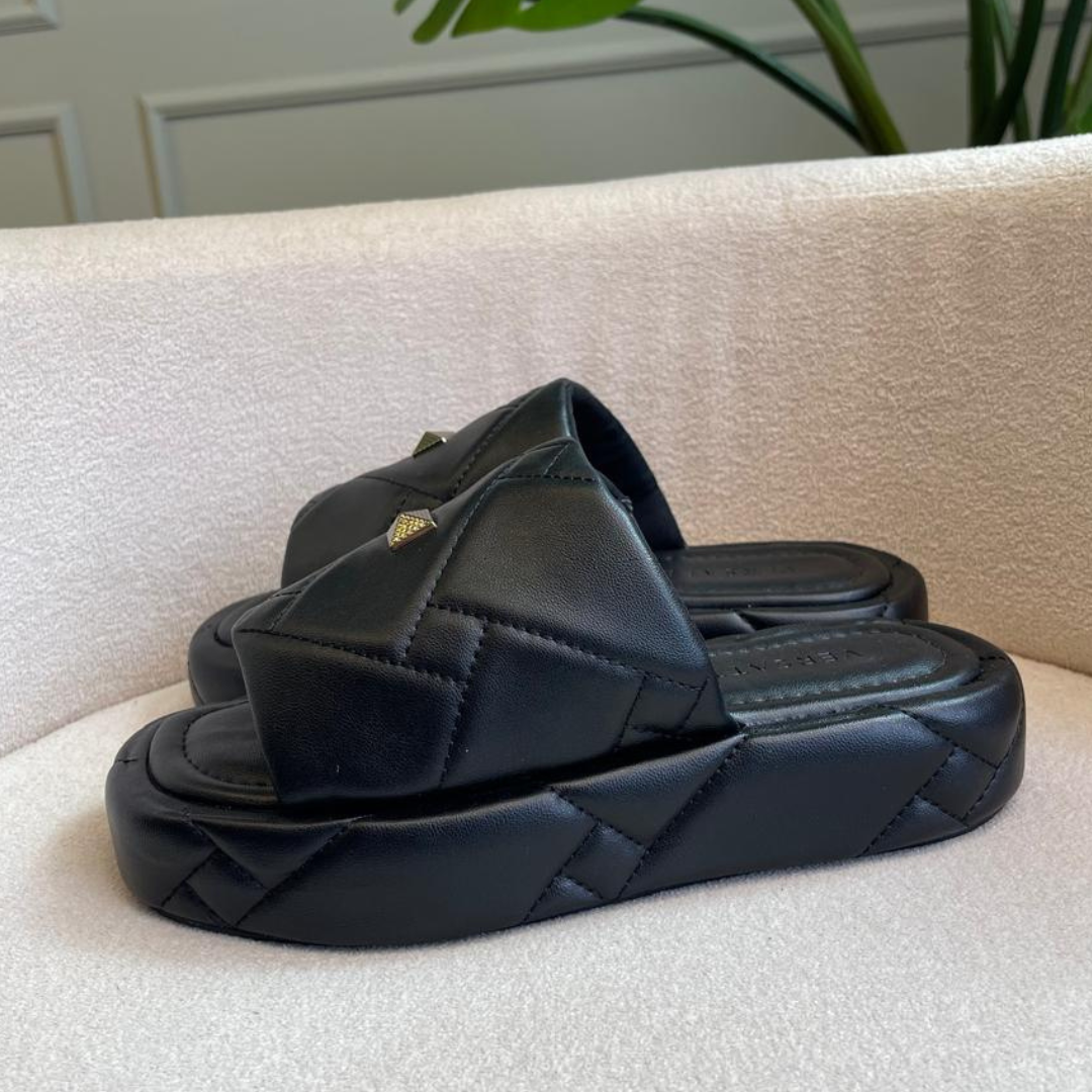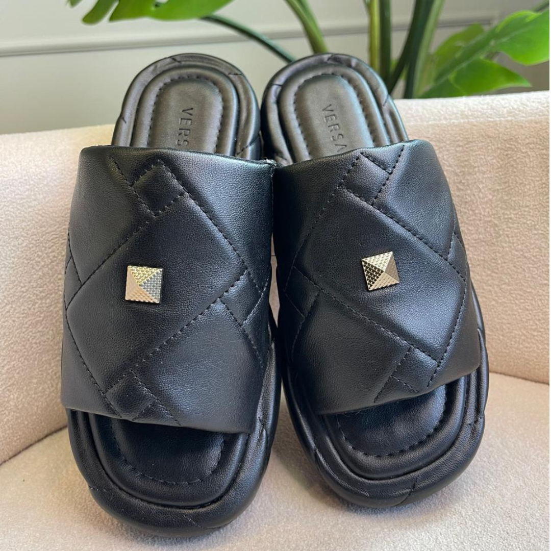 Flat preta matelassada com aplique em pirâmide chumbo