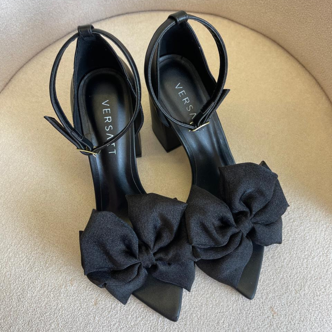 SANDÁLIA PRETA COM LAÇO EM TECIDO ORGANZA