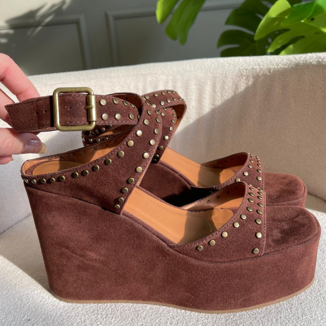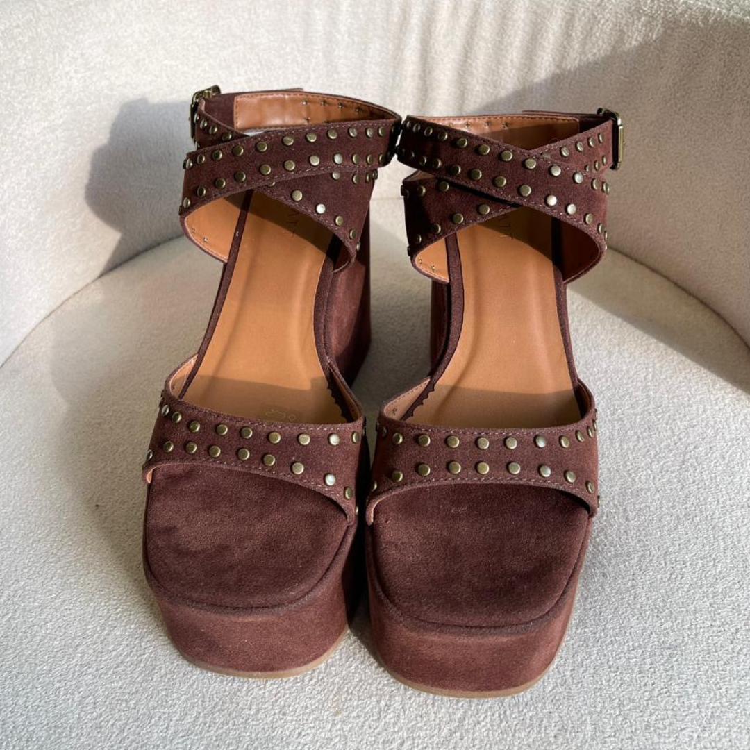Sandália plataforma Marrom com detalhes em ouro velho