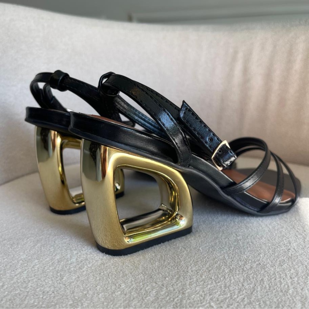 SANDÁLIA COM 3 TIRAS NA COR PRETA COM SALTO METALIZADO