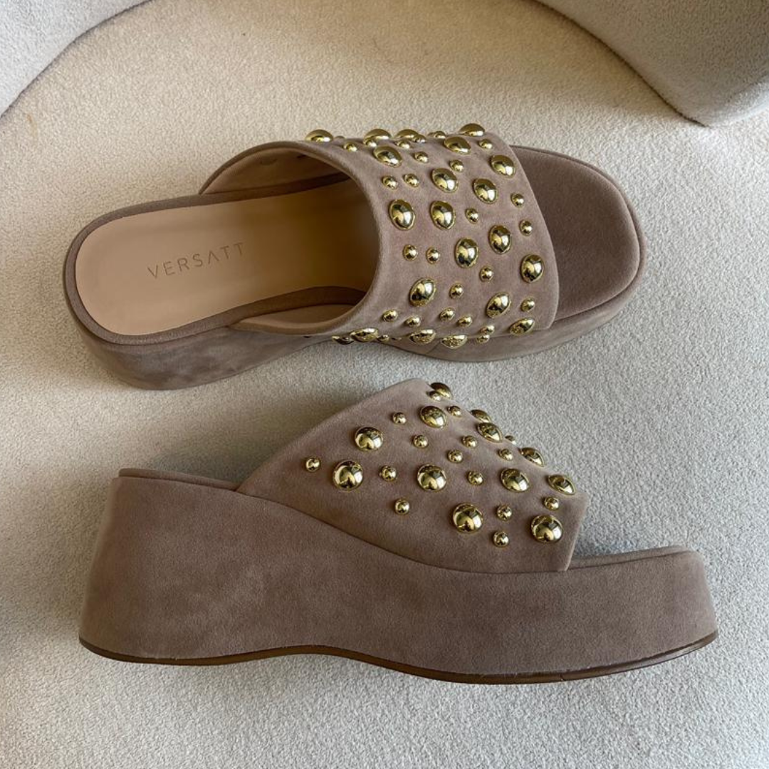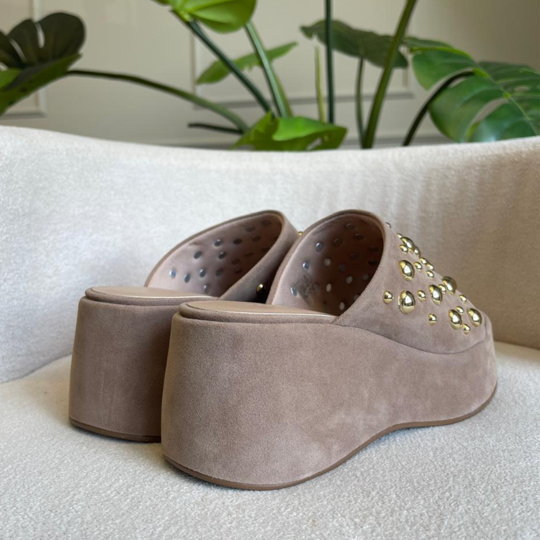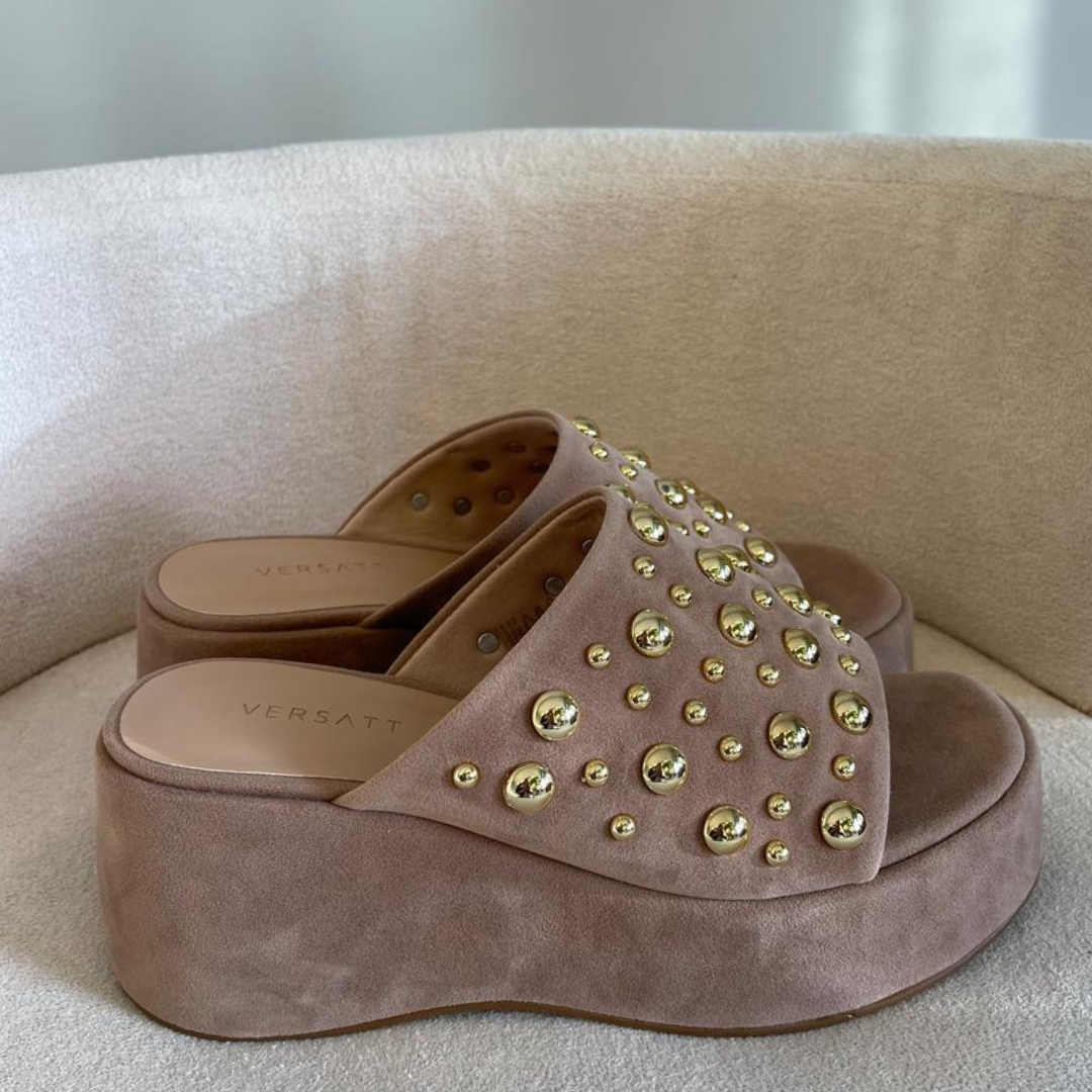 Tamanco em Camurça na cor bege com esferas douradas
